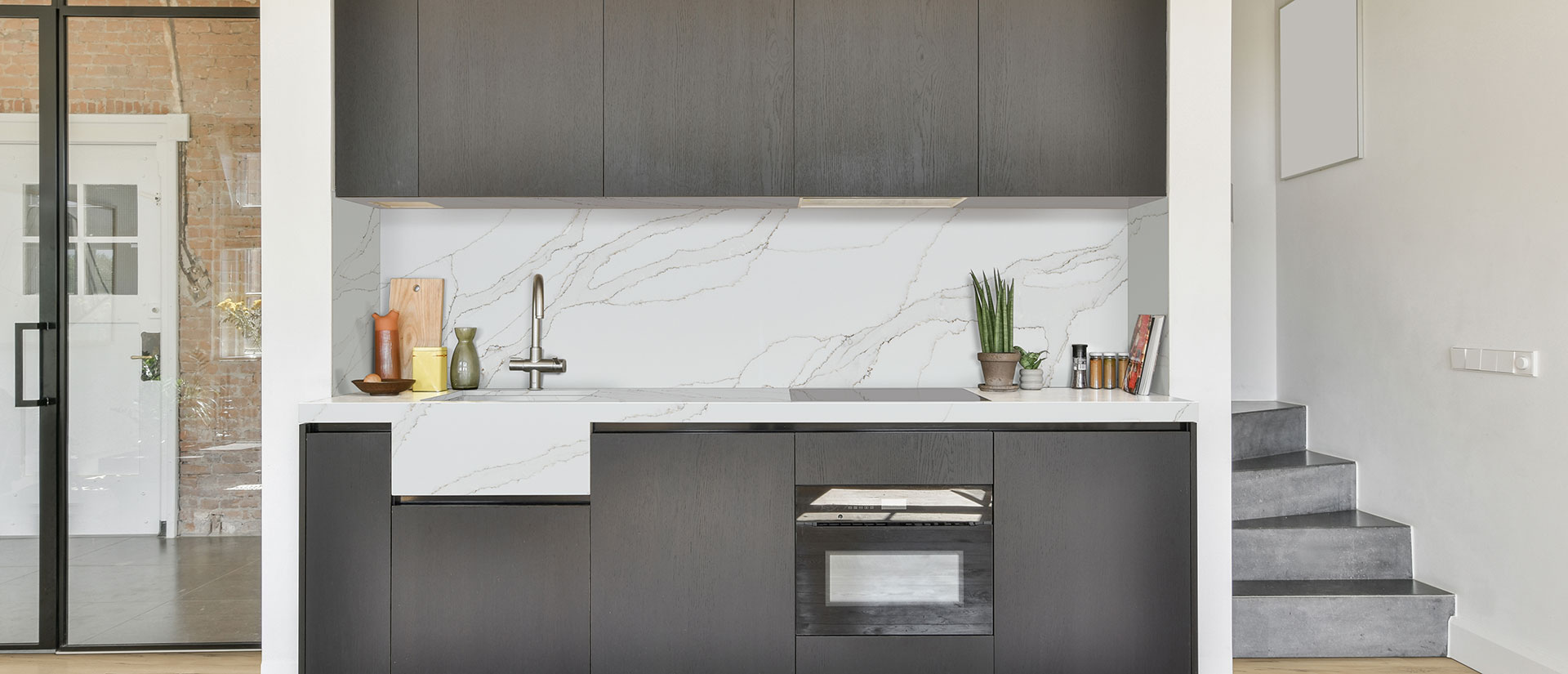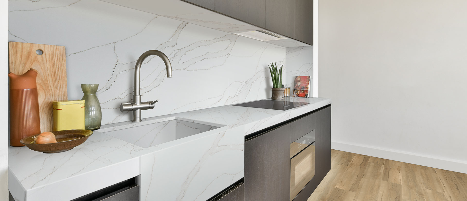 For a clean look, continue Calacatta Izaro up the backsplash as well as on the countertop. The wide veins create a timeless, visual texture that will look great for years to come.