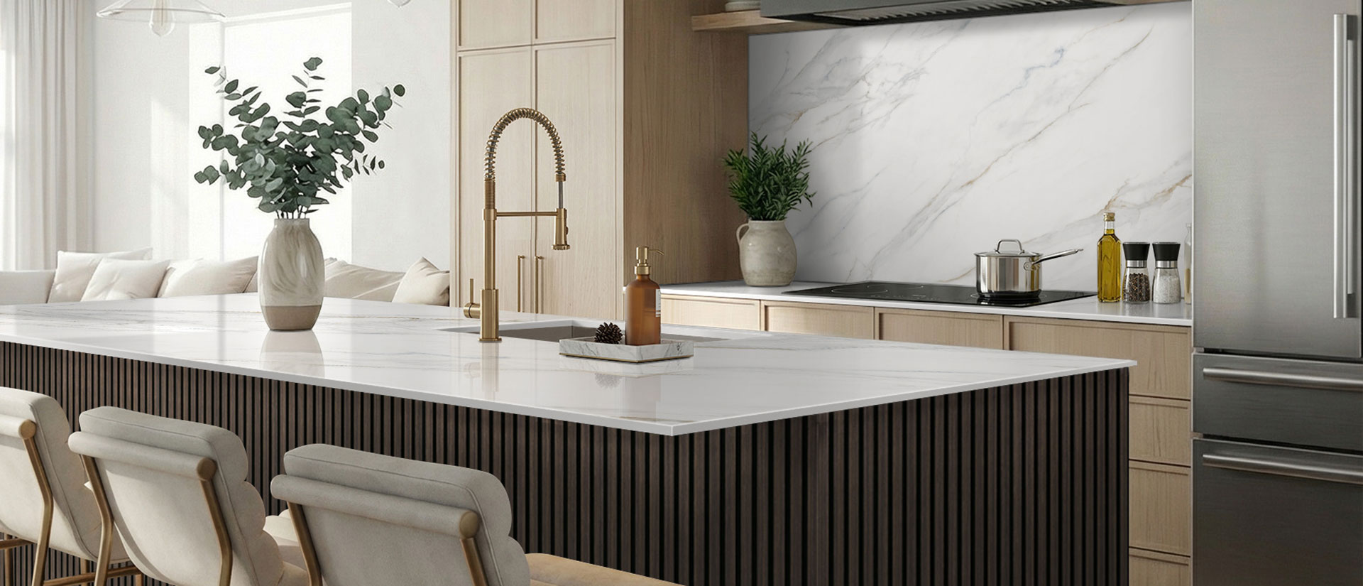Mix Calacatta Lapiza with the Laurel Collection for a fresh combination of warm and cool colors.