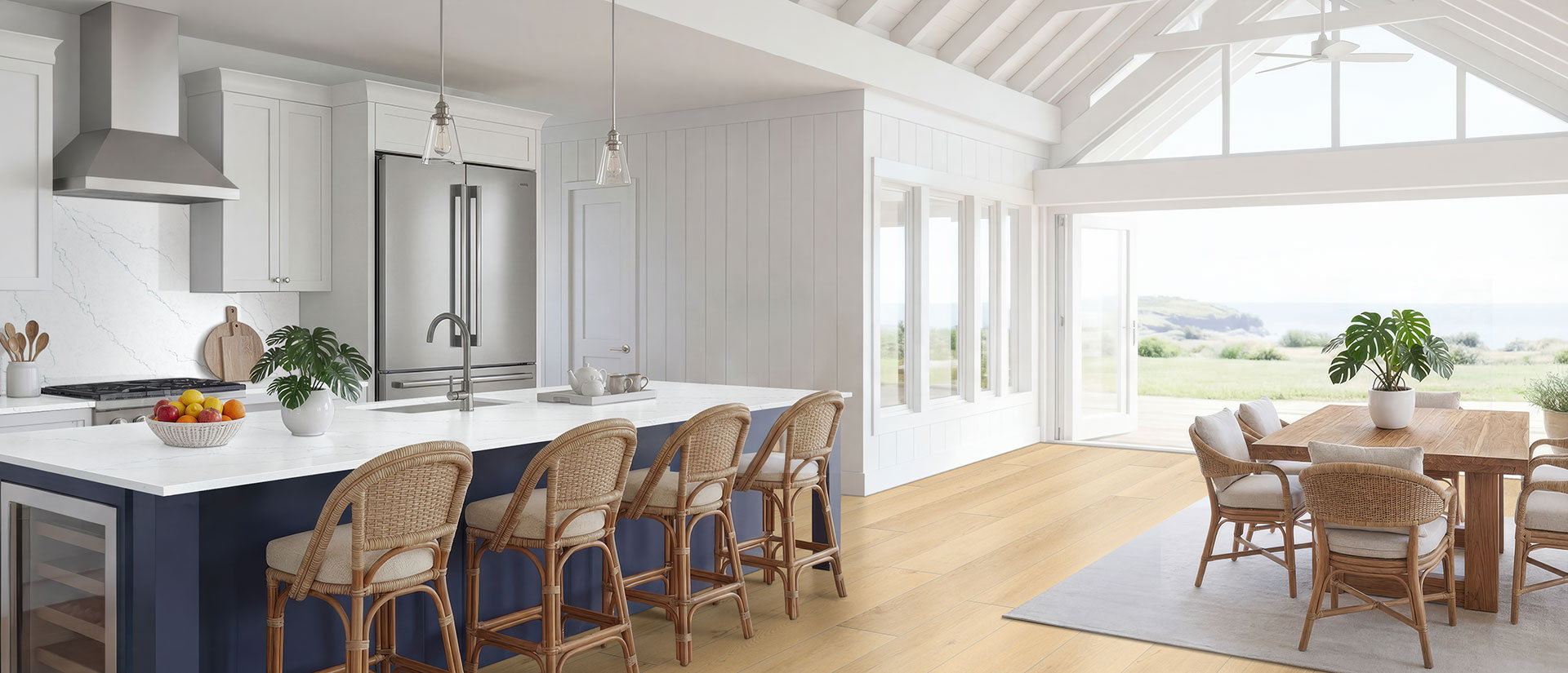 Moody Blues and a hint of navy can really add extra design power to a space. Consider pairing Calacatta Miraggio Cielo with Bay Blue porcelain tile to really lean into the love of nautical hues.
