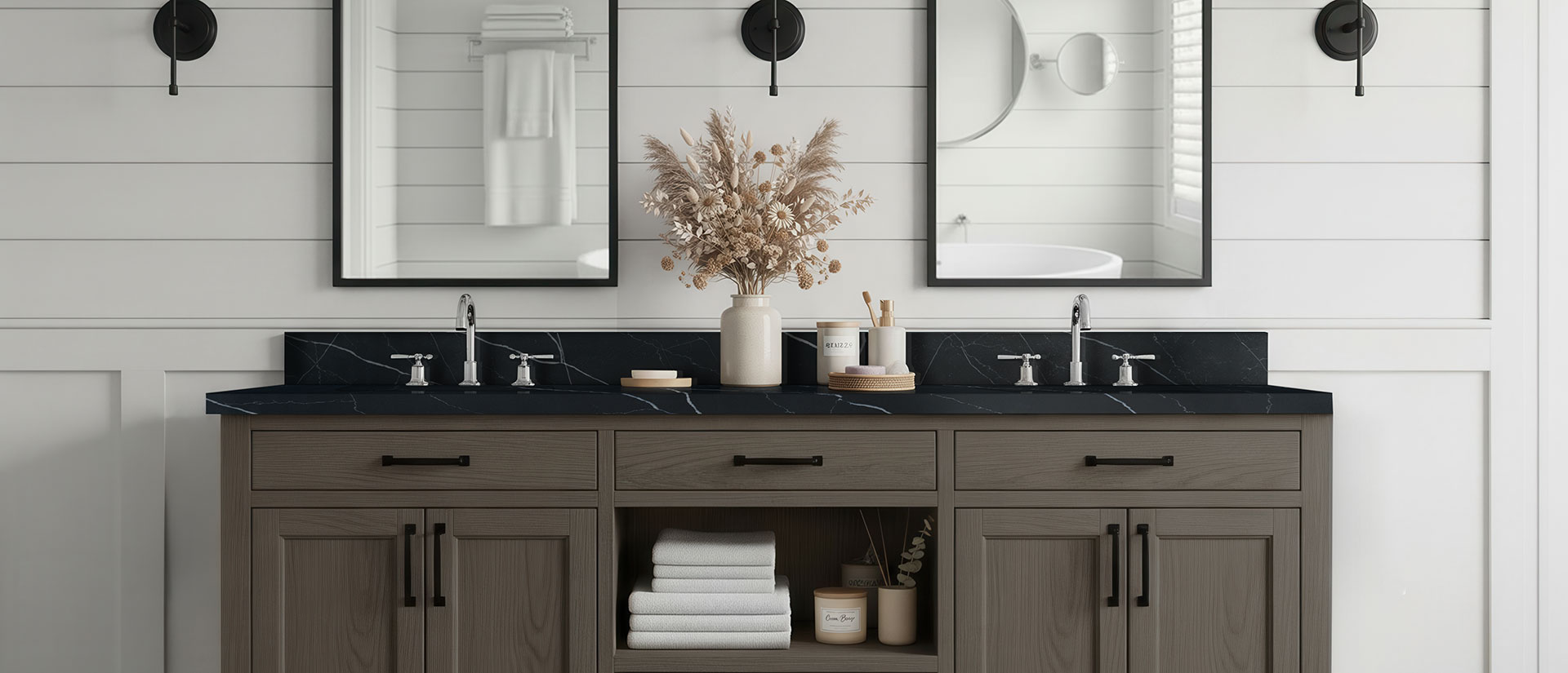 Bold and beautiful describes this black marble-look quartz with majestic white veining; so does sophisticated and dramatic. Rest assured, Marquina Midnight will enhance your residential or commercial space with a daring dose of affordable glam. Like a moonless night, it's the essence of intrigue as black quartz countertops, accent walls, islands, and more. Kitchens, bathrooms, lobby areas, and beyond, this quartz makes an unforgettable statement. Available in 2 cm and 3 cm slabs and prefabricated options for design and installation flexibility.