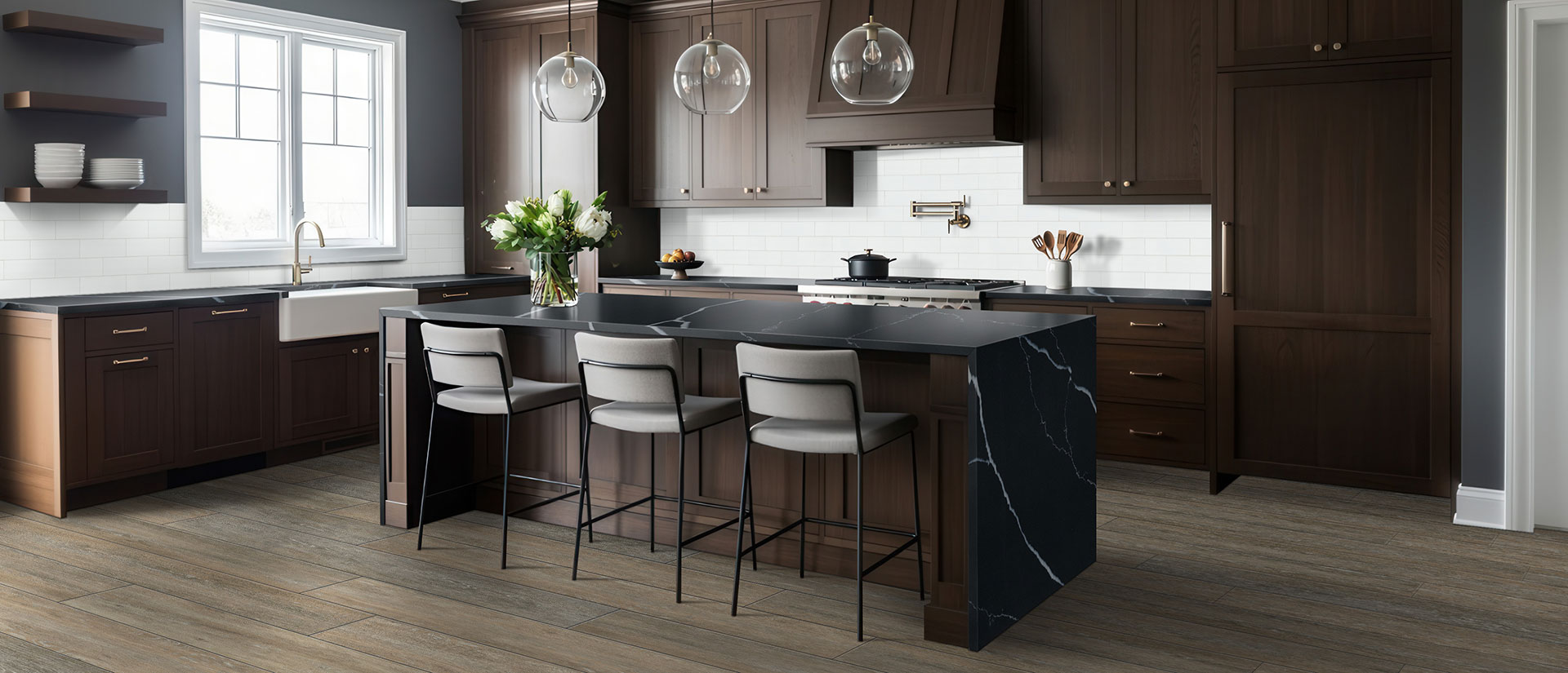 More than Mod is trending all over North America. Pair Marquina Midnight quartz with a punchy geometric, blonde wood floor or crisp white subway for a stylish look.